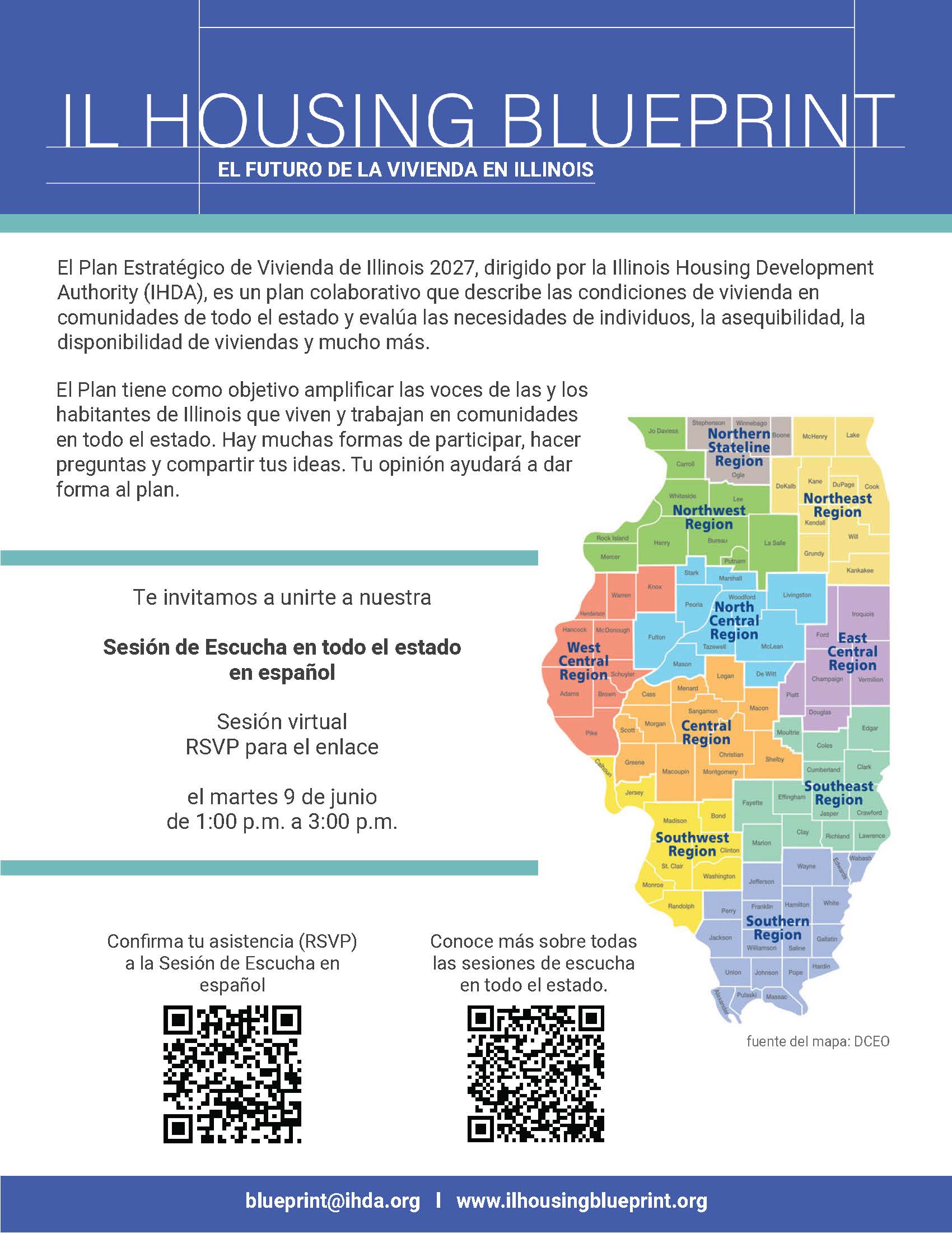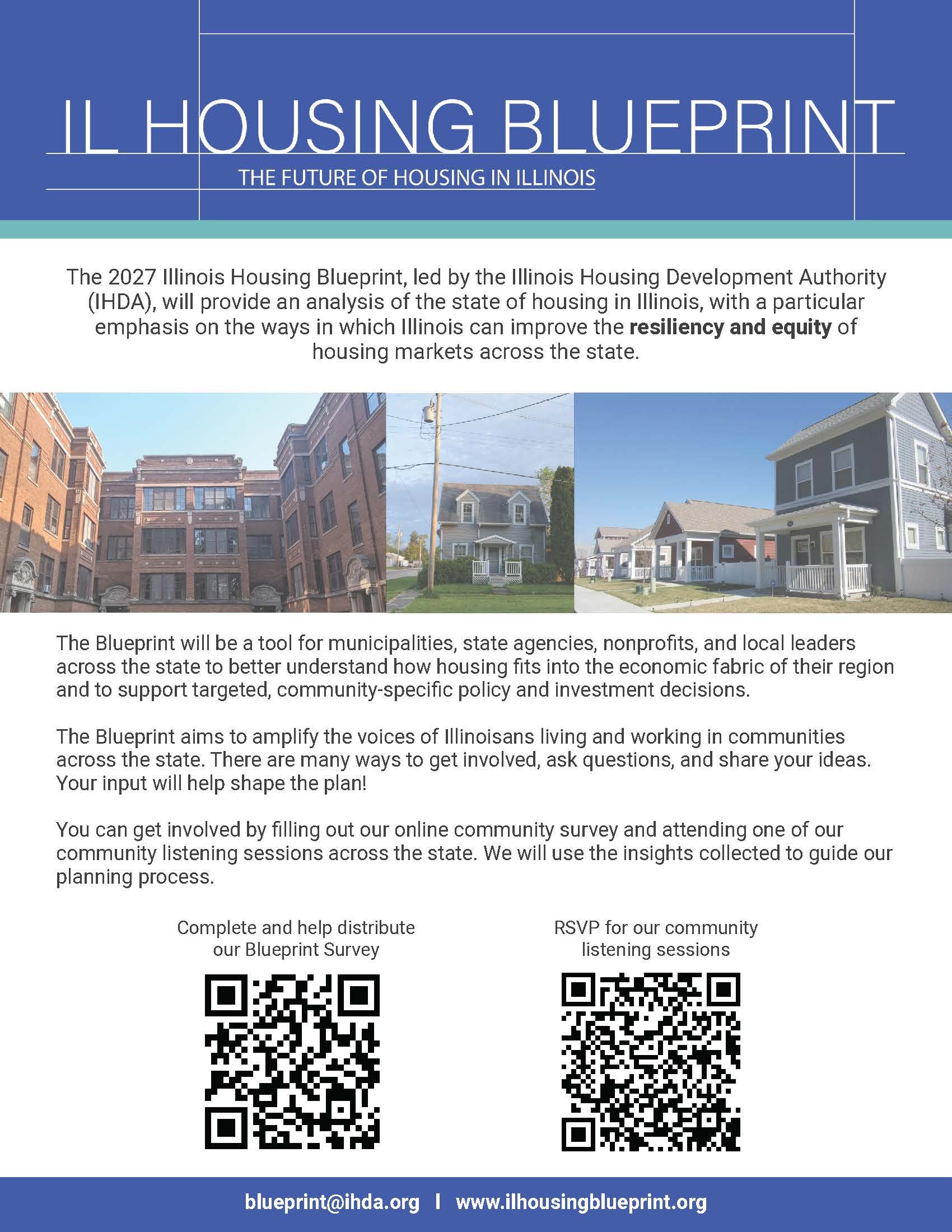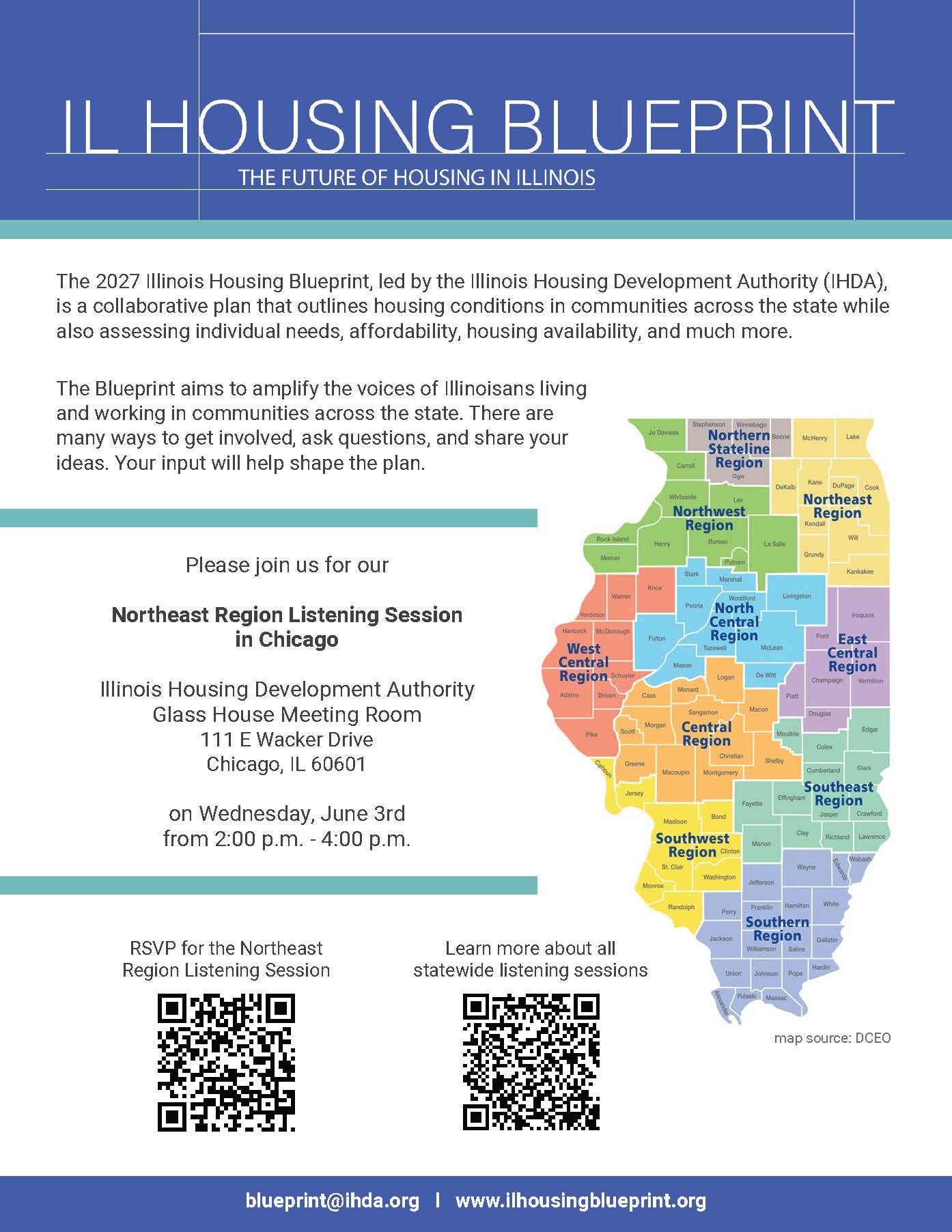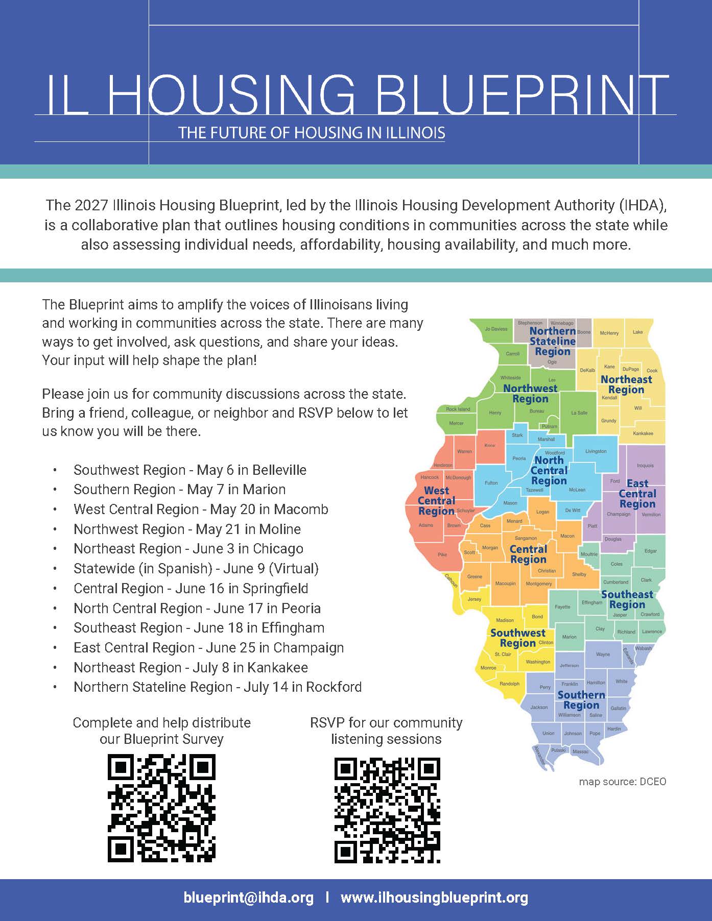 Flyers: Click on the images below to download PDF flyers for the Illinois Housing Blueprint and the Regional Listening Sessions. Click here for the flyers in Spanish.