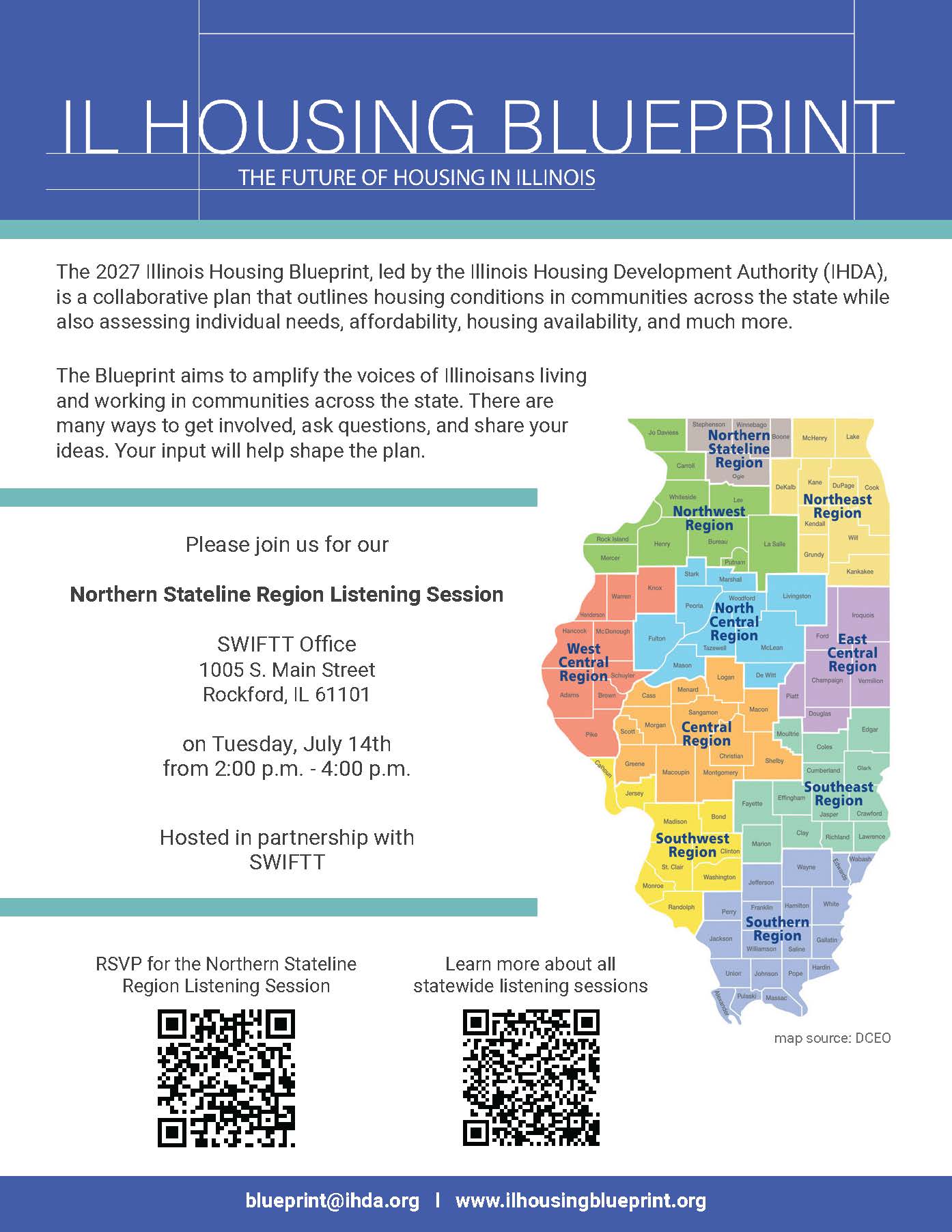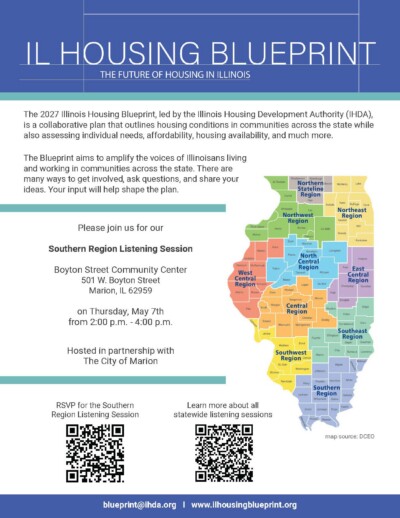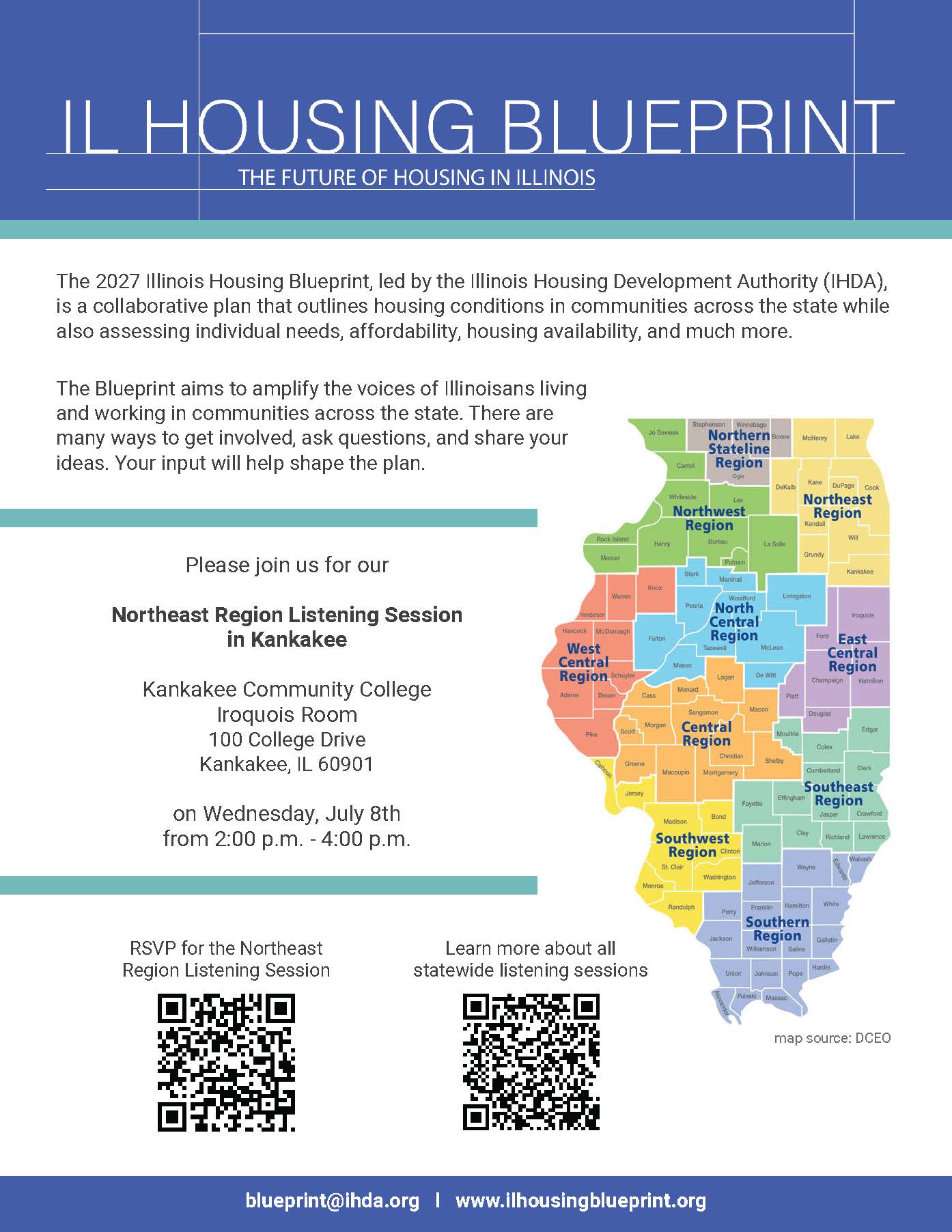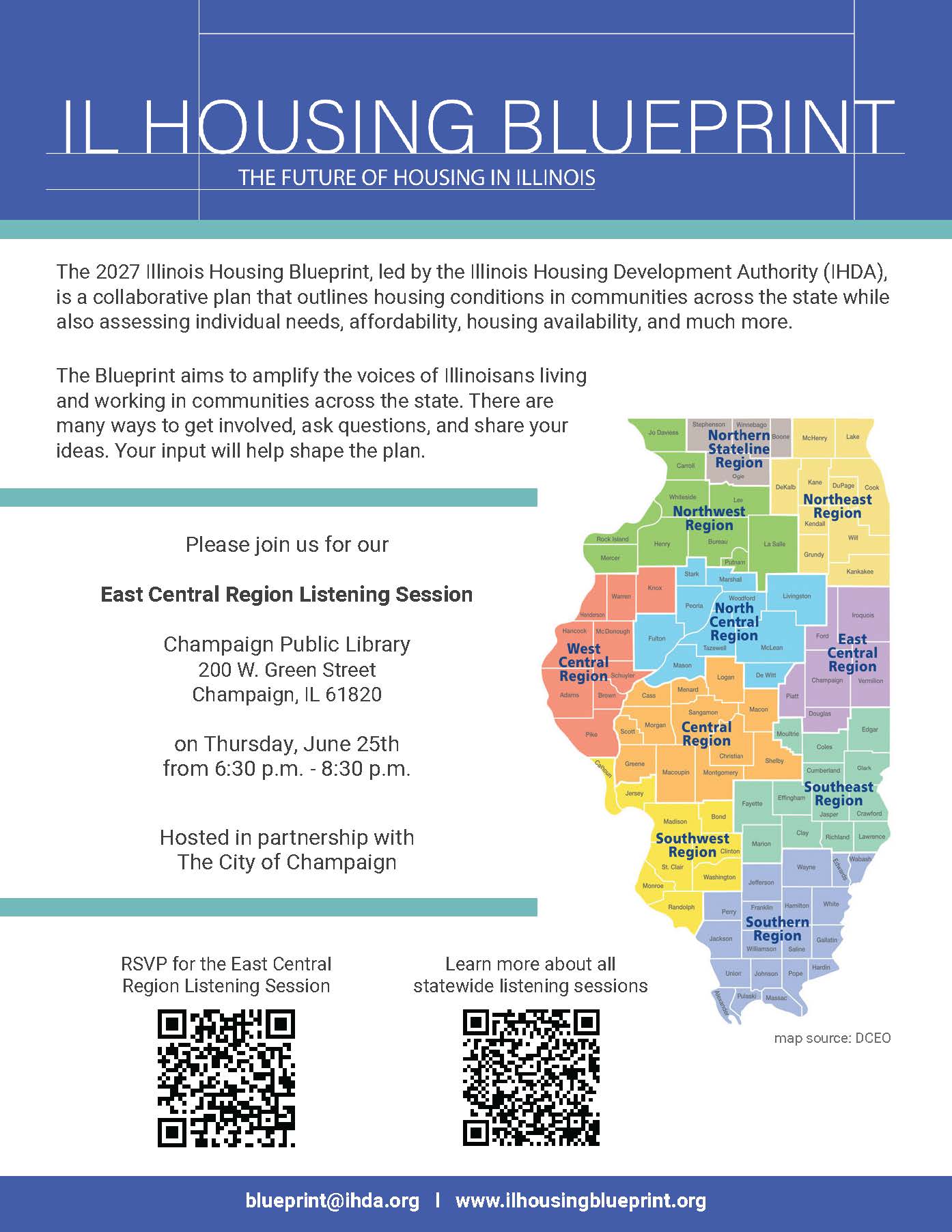 Flyers: Click on the images below to download PDF flyers for the Illinois Housing Blueprint and the Regional Listening Sessions. Click here for the flyers in Spanish.
